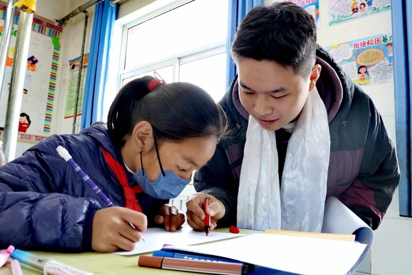 图为艺术与设计学院学生正在一对一指导当地学生绘画 摄影:宗国凯