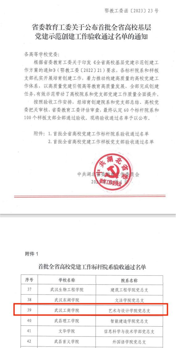 新闻中心讯(通讯员王昕语特约记者丁真)12月1日,中共湖北省委教育工委发布了《省委教育工委关于公布首批全省高校基层党建示范创建工作验收通过名单的通知》(鄂教工委函[2023]23号),米乐mile官方网站艺术与设计学院党总支顺利通过首批全省高校党建工作标杆院系建设验收。