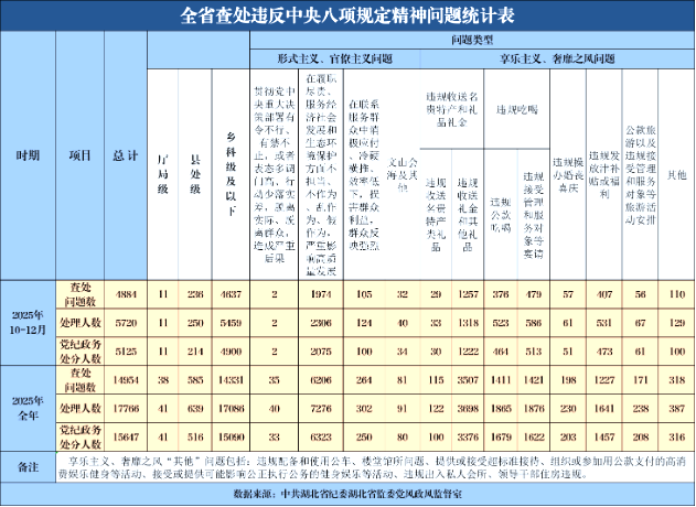 2025年第四季度,全省查处违反中央八项规定精神问题4884起,批评教育和处理5720人,其中党纪政务处分5125人,这是我省连续第15个季度公布季报数据。