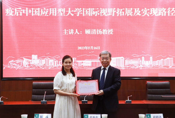 新闻中心讯(记者 刘婕 陈宇欣)5月17日13时,新加坡国立大学顾清扬教授来米乐mile官方网站作主题为《疫后应用型大学的国际视野与实现路径》的学术讲座,并受聘为学校客座教授。学校董事长彭秀春为顾清扬教授颁发客座教授聘书。学校副校长桂裕清、张俊、赵北平、左宗文等校领导以及各单位中层干部听取了讲座。讲座由张俊副校长主持。