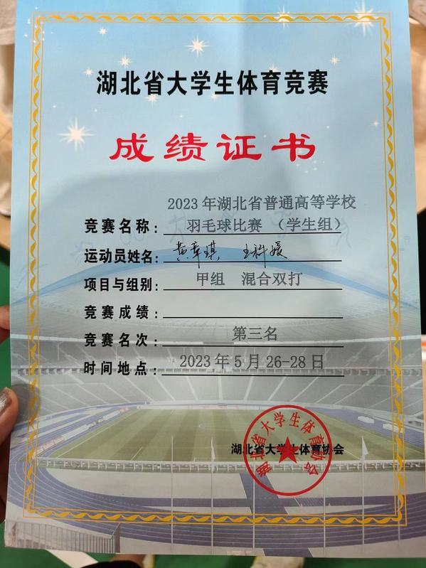 本届2023湖北省大学生羽毛球锦标赛由湖北省大学生体育协会主办,比赛分为团体比赛和单项比赛两个比赛项目,两个项目各分为四组进行比赛,其中单项比赛主要包括男女单打、男女双打和混合双打三种。团体赛采用三场二胜制,主要分为两个阶段进行,第一阶段采用分组循环;第二阶段采用交叉淘汰出前八名,而单项赛采用淘汰赛及附加赛的方法决出前八名。米乐mile官方网站队员王科媛、黄章琪在比赛中相互配合、协同作战,凭借出色的表现获得了第三名。