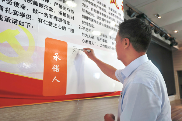 图为刘生元书记带领大家签订师德承诺书 摄影:芮雨欣