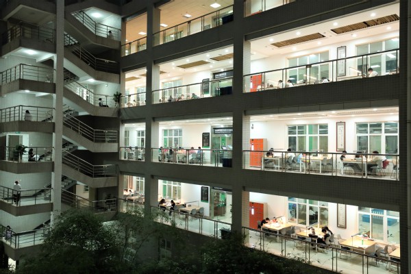 图为晚上图书馆内灯火通明,学生正在用心学习 摄影:胡燕