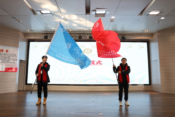 开营仪式上还举行了授旗仪式环节,本次135位新教师共分为“弘德队”“博问队”两大队和14个小组,由计算机与自动化学院教师刘天其、管理学院教师张斟分别担任旗手,并上台接受队旗。