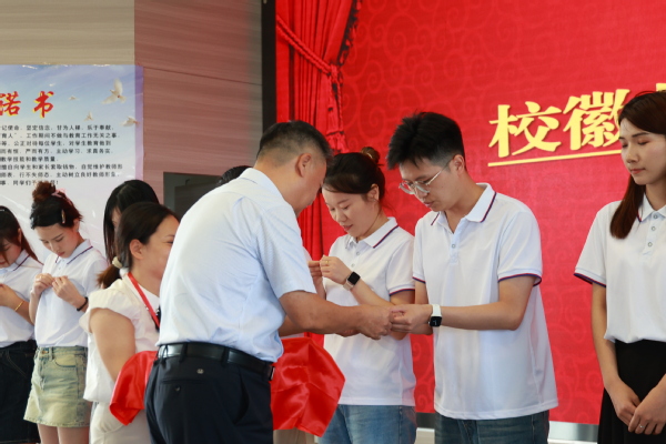 刘生元书记为新进教职工代表佩戴校徽,衷心祝贺新进教职工们成为武工商的一份子,并带领大家举行了新进教职工入职宣誓仪式,签署了《教师师德承诺书》。