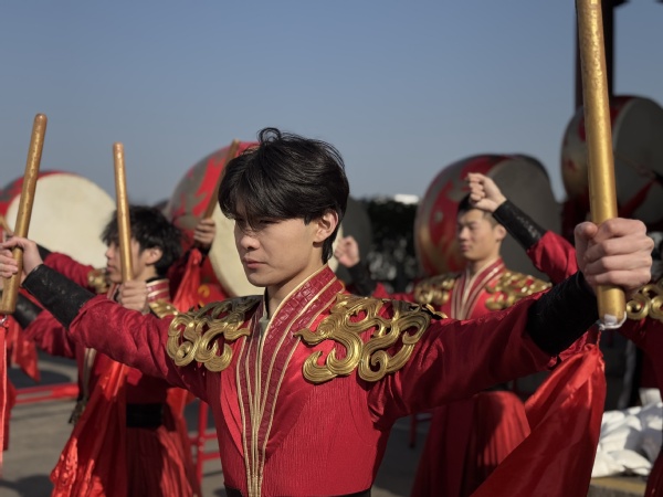 图为武工商学子参与央视春晚武汉分会场主题节目《星汉耀江城》鼓阵表演录制