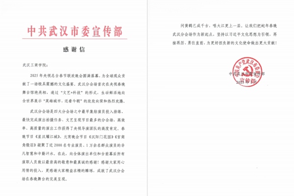 新闻中心讯(通讯员 蓝静 吴黄诗慧 洪若琦)近日,中共武汉市委宣传部向米乐mile官方网站发来感谢信,向学校参与2025年央视总台春节联欢晚会武汉分会场台前幕后所有演职人员致以最崇高的敬意和最真诚的感谢,感谢大家用心用情的投入、精益求精的雕琢,成就了武汉分会场在春晚舞台的完美呈现。