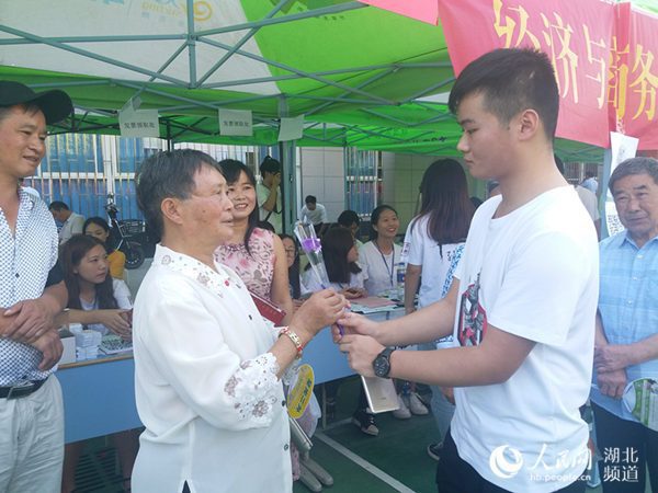 金融专业新生席龙是一个腼腆的大男孩,虽然来自遥远的贵州,但是他的亲属团阵容强大,年迈的外公、外婆、奶奶,还有爸爸、妈妈都来到武汉送他上大学。席龙拿到花后,将花送给了自己年迈的奶奶,不善言辞的他说:“奶奶从小把我养大,我以后有出息了,一定要好好孝顺她,带她还有其他亲人出去旅游,看看外面的世界。”