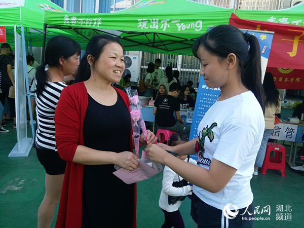 图为财务管理专业新生李飘送花给妈妈(蓝静 摄)