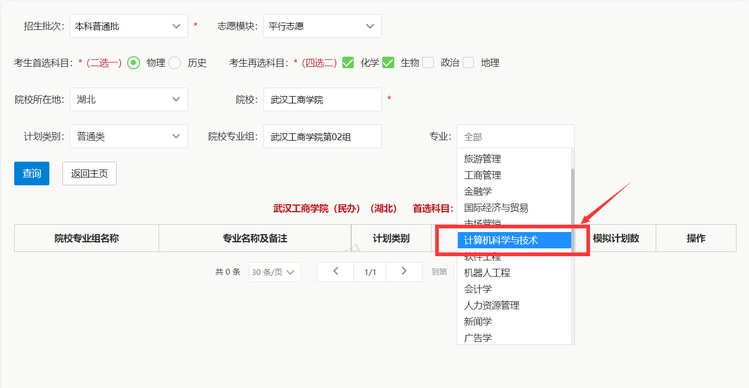 院校专业组默认为全部,考生可以选择全部,也可以选择某一院校专业组。比如:选择计算机科学与技术