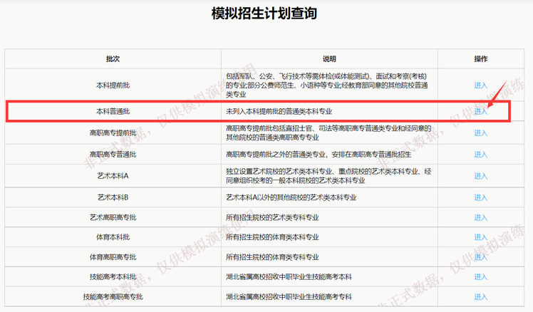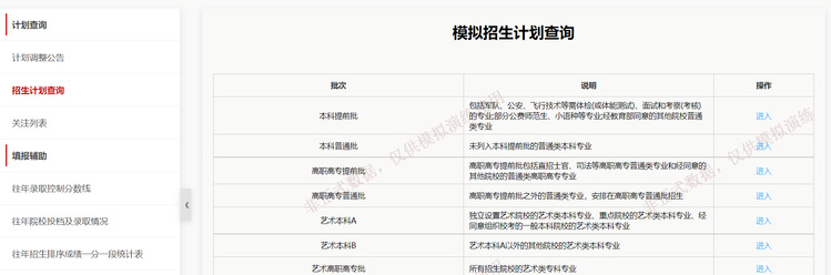 首页默认为招生计划查询主页,以本科普通批为例,点击进入按钮,进入该批次模拟招生计划查询页面。