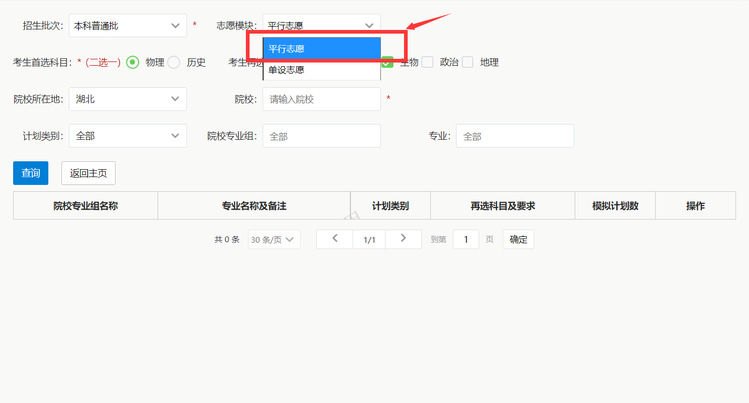志愿模块默认平行志愿,考生必须先选择某一志愿。比如:志愿模块选择平行志愿。