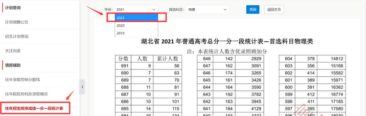 点击左侧导航栏-往年招生排序成绩一分一段统计表,共显示前三年的湖北省录取控制分数线,默认显示上一年的湖北省录取控制分数线,点击左上角的年份,可以切换不同年份。