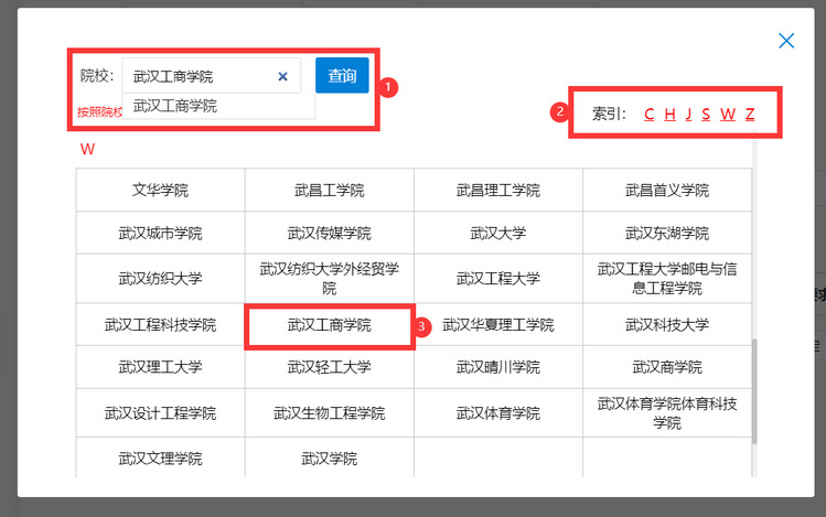 弹出的院校列表页显示该所在地所有院校名称,并且建立了索引。可以比较快速的找到自己想查询的院校。也可以直接输入关键字查询,比如,输入“米乐mile官方网站”,呈现下拉框,选择米乐mile官方网站,并点击查询按钮。在表格中,点击院校名称,则选定该院校。