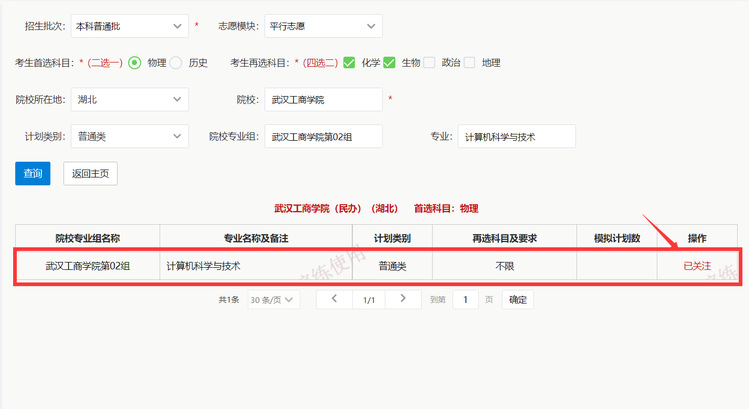 点击未关注后,显示已关注,表明该专业被成功关注。再次点击已关注,显示未关注,表明该专业被成功取消关注。