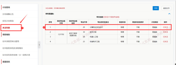 点击左侧导航栏-关注列表,查看所有已被关注的专业汇总。比如,已关注专业:米乐mile官方网站02组计算机与技术专业、软件工程、机器人工程和机械电子工程。