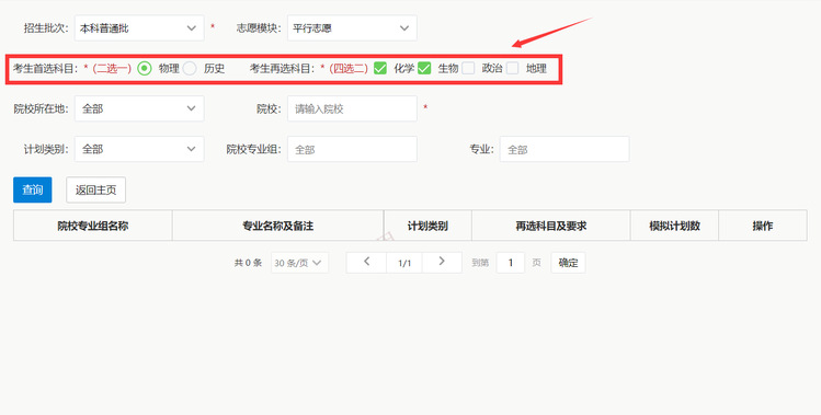 首选与再选科目默认为空,考生必须先勾选首选与再选科目。比如:首选物理,再选化学生物。