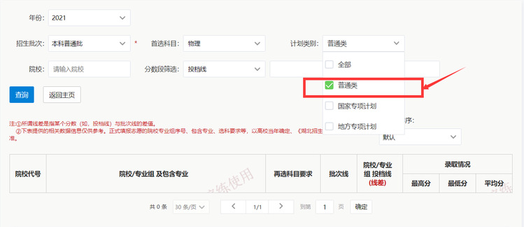 计划类别默认为全部,考生可以选择全部,也可以选择某一计划类别。比如:选择普通类。