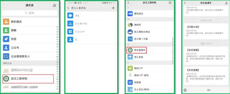 然后再点击企业应用,进入校长直通车,点击“进入”,绑定好个人的信息后,即可在应用里给校长反映自己在学校里的情况,方便处理在学校遇到的难事。