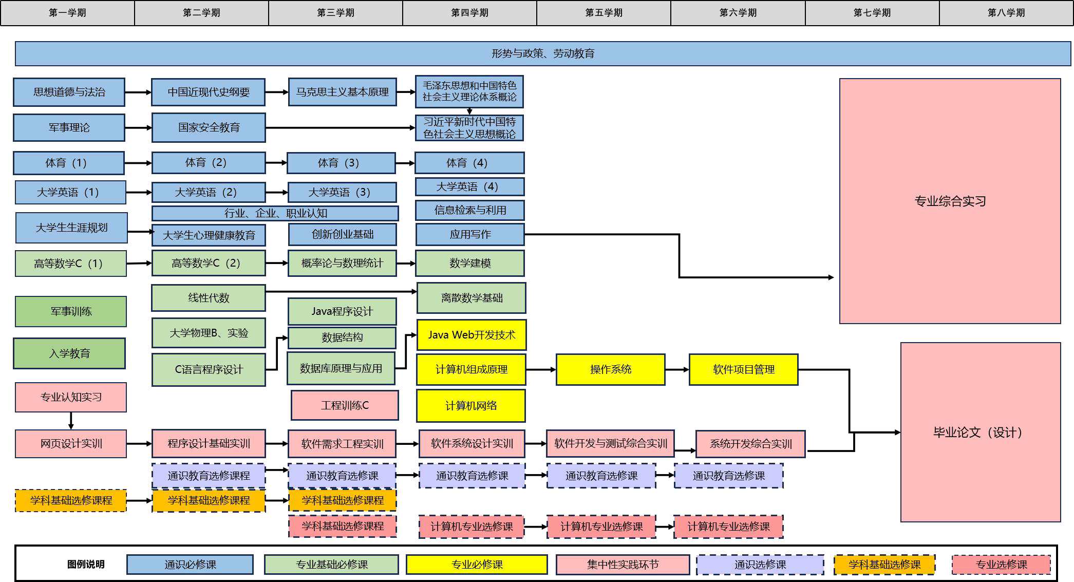 专业核心课程:C 语言程序设计、数据结构、Java 程序设计、离散数学基础、数据库原理与应用、操作系统、计算机网络、软件项目管理