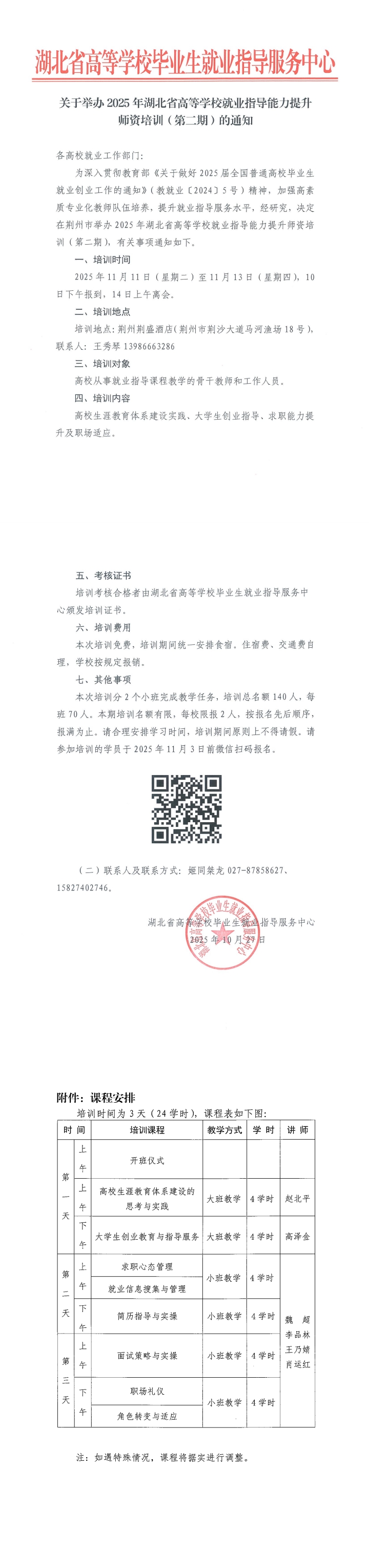 关于举办2025年湖北省高等学校就业指导能力提升师资培训(第二期)的通知