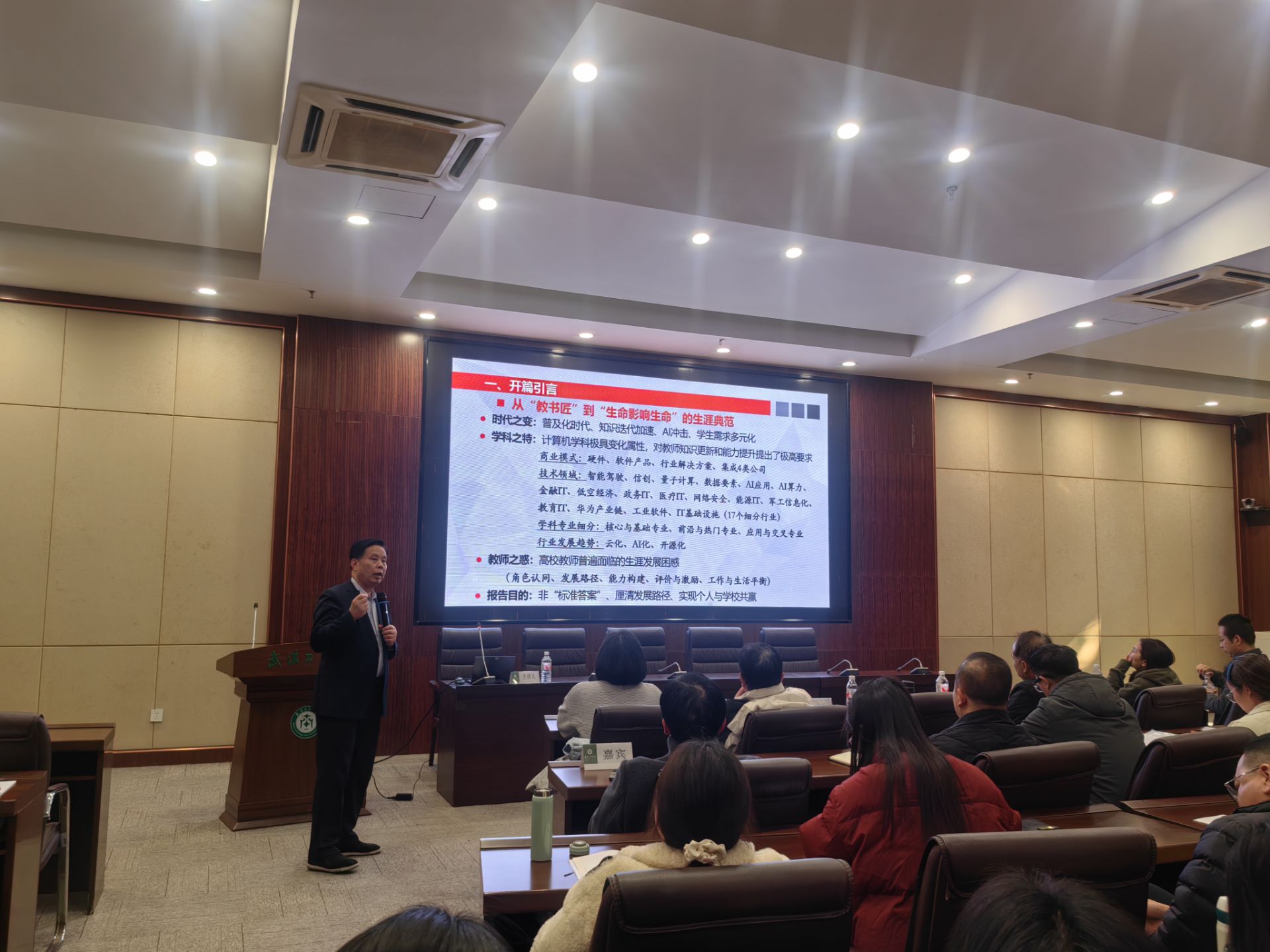 讲座伊始,何院长对赵校长的莅临分享及张金元会长的到场支持表示热烈欢迎与衷心感谢。他指出,当前计算机学科知识迭代加速、行业细分多元,教师面临着角色认同、能力升级、工作与生活平衡等多重挑战,此次讲座恰逢其时,希望全体教师能认真学习、深入思考,将所学所得转化为职业发展的内生动力,为学院人才培养与学科建设注入新活力。