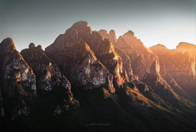 这是王夏平朋友圈置顶里一组照片的其中一张:晨辉像揉碎的金箔,轻覆在群峰的褶皱里。嶙峋崖壁浸着暖光,棱角都软成了温柔的剪影——山风裹着雾的余温,正把昨夜的暗,酿成今日的锋芒。