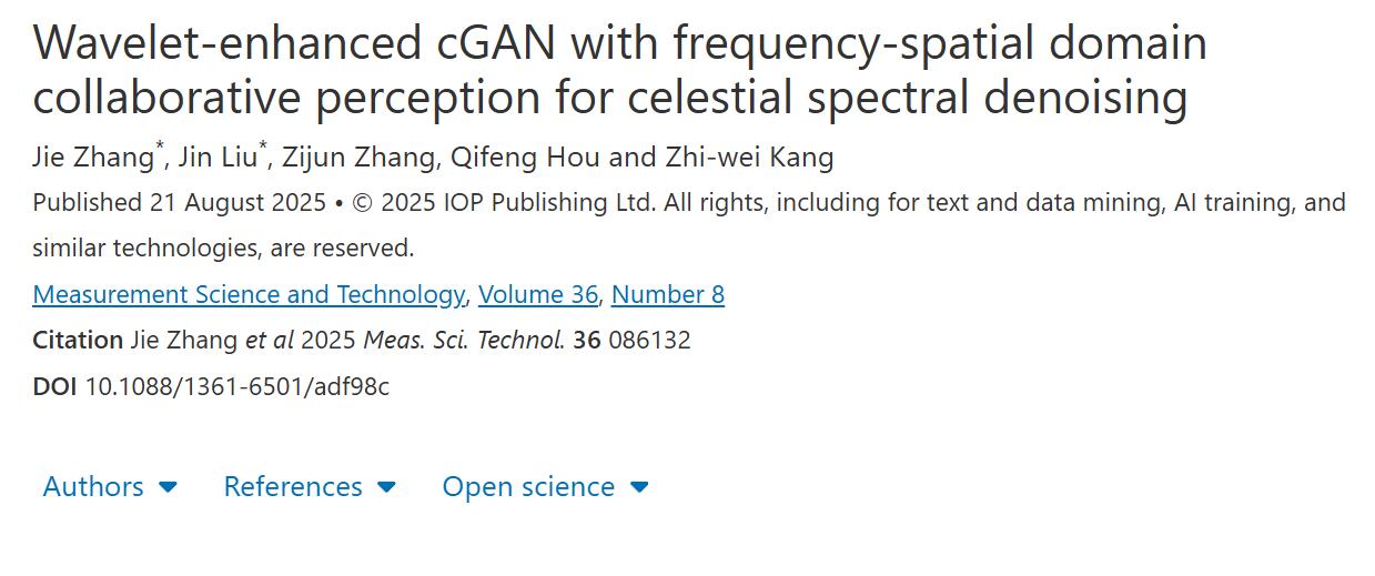 近日,我院青年教师张杰与合作者在国际知名期刊《Measurement Science and Technology》发表最新研究论文,题为 “Wavelet-enhanced cGAN with frequency-spatial domain collaborative perception for celestial spectral denoising”。该研究针对多普勒测速导航中由于光谱噪声导致测速精度下降的问题,提出了一种用于天体光谱去噪的WCGAN方法。该方法结合双树复小波变换与条件生成对抗网络,在频域和空间域协同建模光谱特征。通过多尺度小波分解,模型能够同时保留低频整体结构和高频细节信息,从而提高噪声抑制能力与谱线重建精度。该论文以米乐mile官方网站为第一完成单位,张杰为第一作者。