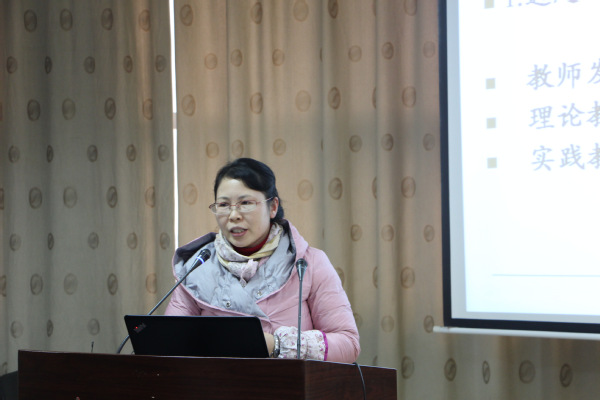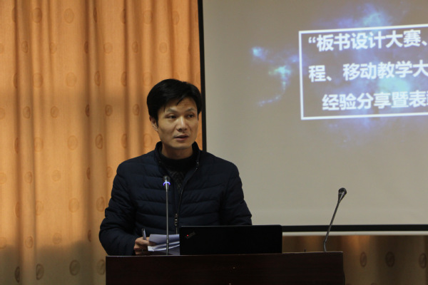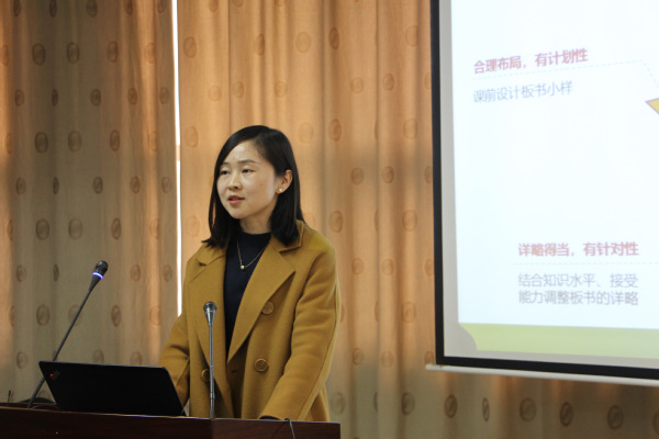 信息工程学院葛蓁老师作为板书设计大赛一等奖获得者发言。谈到如何设计好的板书时,葛蓁老师颇有感触:“高效的课堂离不开板书,教师发展离不开板书,教书育人离不开板书。”她强调,在板书设计上,要注重时机,综合运用多种板书类型,色彩主次分明,符号使用要谨慎,注意前后一致。“好的板书不等于成功的教学,但成功的教学离不开出色的板书。要做一名有心有意、合格的老师,好的板书基本功必不可少。”