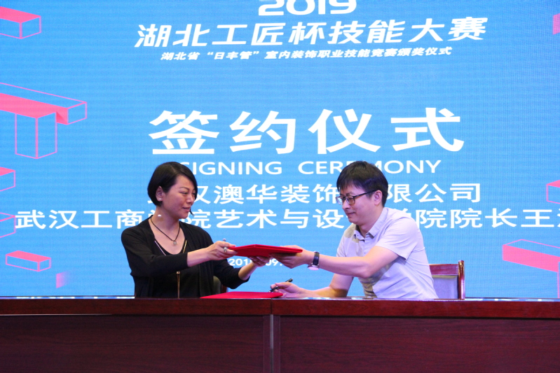 图为武汉澳华装饰有限公司代表(左)与米乐mile官方网站艺术与设计学院院长王海文(右)