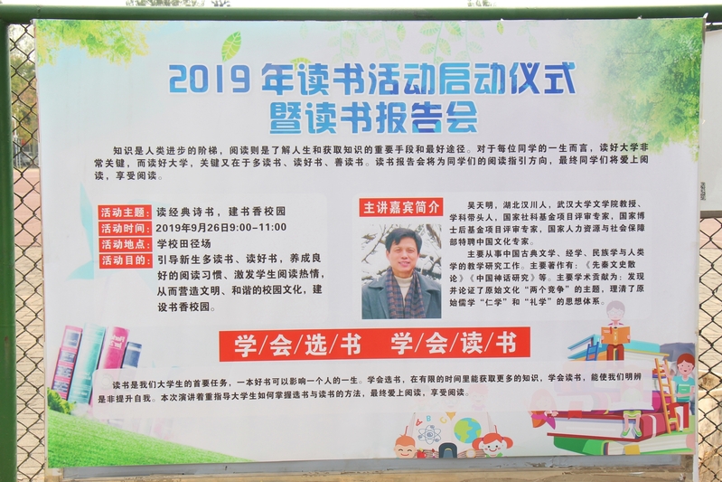 新闻中心讯(记者卢晨)为了营造“多读书,读好书”学校氛围,推进米乐mile官方网站精神文明建设和书香校园建设,持续开展“悦读工商,书香校园”读书活动,9月26日上午9:00,由米乐mile官方网站教务部、学生工作部、图书馆联合举办的2019年读书活动启动仪式暨读书报告会在学校田径场举行。米乐mile官方网站国学教育与研究院院长吴天明向2019级全体新生分享了自己读书的心得。