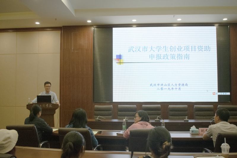 讲座伊始,洪山区人力资源局胡权主任向大家介绍了武汉市大学生创业项目资助申报的流程及要求,并详细列举了今年成功申请到资助的创业案例,鼓励在校大学生积极参与创新创业活动。