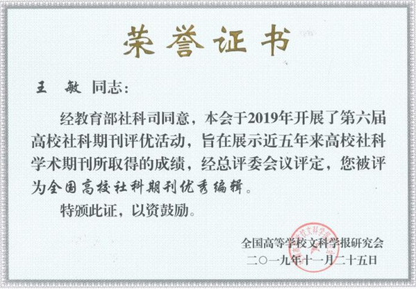 新闻中心讯(特约记者 晴朗)11月25-28日,“双一流”建设背景下高校学术期刊的责任与使命学术研讨会暨全国高校文科学报研究会第八届理事会第五次会议在广东肇庆召开。会议对 2019 年第六届全国高等学校文科学报研究会评优活动中的获奖单位和个人进行表彰。《米乐mile官方网站学报》荣获“全国高校社科优秀期刊”称号,王敏编辑被评为“全国高校社科期刊优秀编辑”。