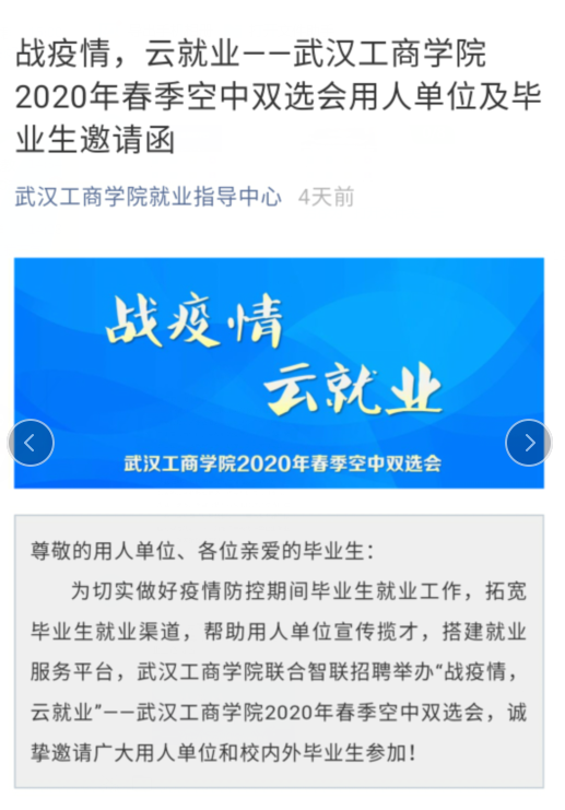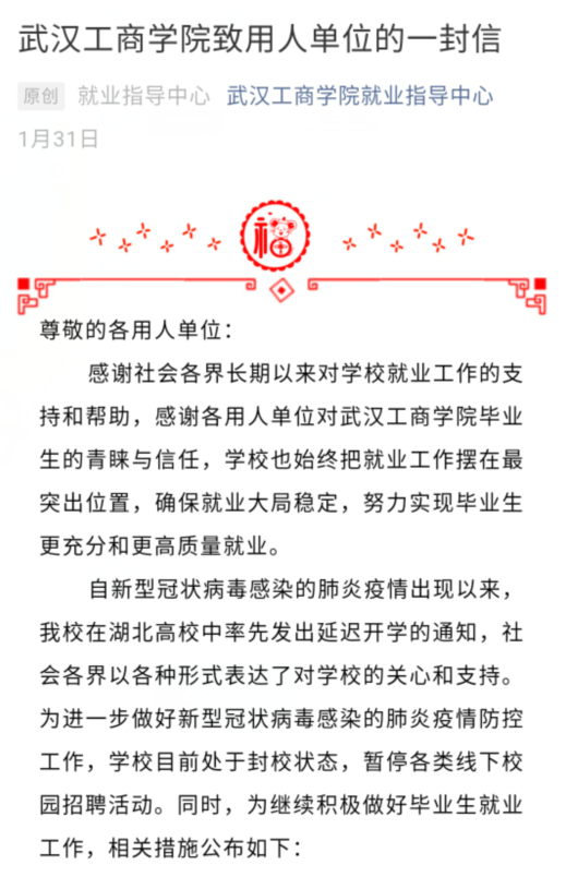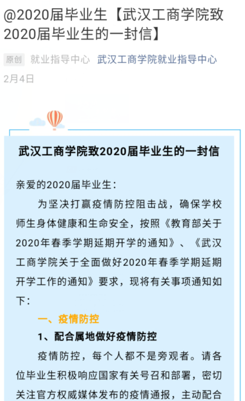 图为招就部微信公众号发布的《米乐mile官方网站致2020届毕业生的一封信》
