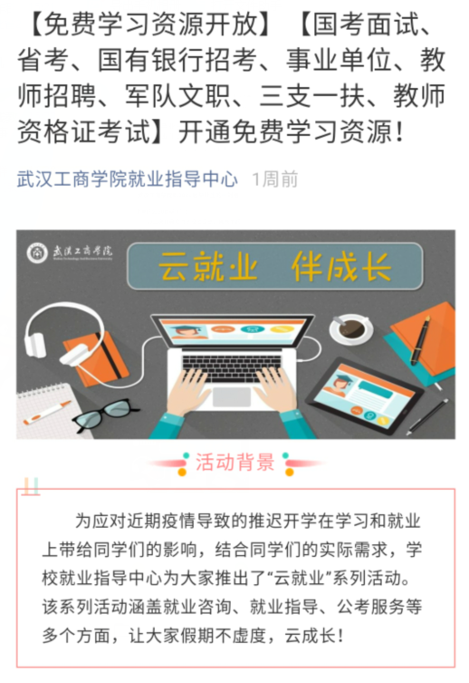 为满足报考公务员、选调生、事业单位、教师资格证、各类英语考试等意向毕业生的学习需求,学校与相关培训机构合作,面向本校毕业生提供了系列网课,帮助学生合理规划在家时间,充分准备各类考试,提高就业竞争力。培训通知自2月3日发布以来,迄今已有300余名学生报名了相关课程。