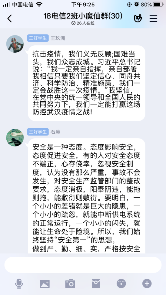 辅导员安排通知学生错峰学习,并在利用QQ群空间平台,同学们积极的发表自己的心得体会。以下为部分截图:
