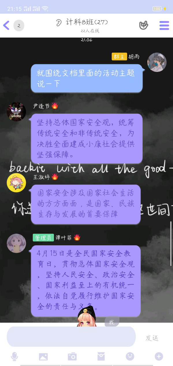“重要通知:针对2020年第5个“全民国家安全教育日”主题教育活动,今天晚上6点我会群课堂视频直播,要求每位同学观看,届时直播间会同频学习视频,视频时长40分钟,大家进直播间互动,发表自己文字意见,积极发表哈!”这是电商学院老师在年级群中发的通知。4月15日舒娟老师利用QQ群课堂开启直播“云”班会,在直播班会中同频播放公共安全领域专家,中国工程院院士范维澄院士主讲的“总体国家安全视角下的疫情防控”2017级同学在直播间认真观看并积极互动。“国家安全的定义是什么?面对疫情,大学生应该做什么……”范维澄院士在《总体国家安全观视角下的疫情防控》向同学们讲解,“国家安全,人人有责。身为一名新时代的青年大学生,我们要正确认识国家安全形势,增强‘安而不忘危‘的忧患意识,时刻紧绷安全之弦。”同学们表示听完了这堂安全课后,对自觉培养国家安全和个人安全密切相关的认识再上一个台阶。