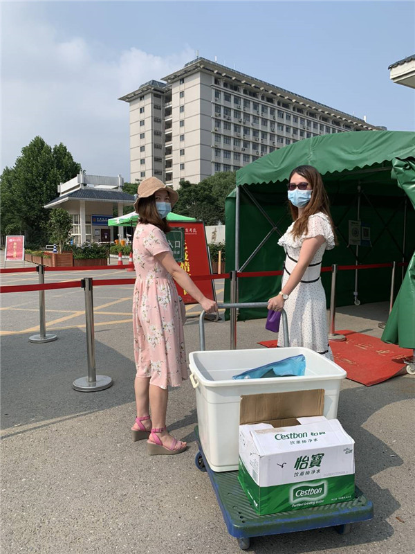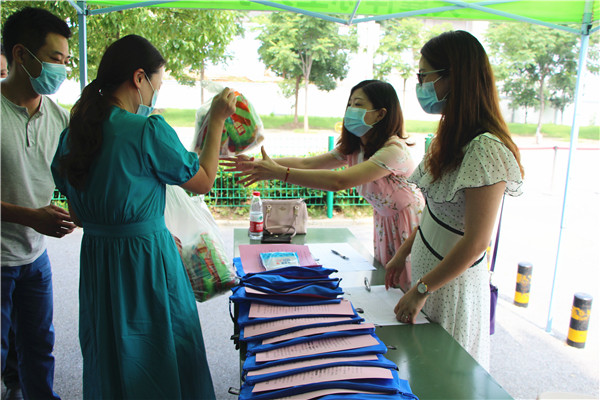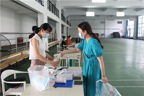 图为校办主任狄奥给一站式服务中心的老师发端午节慰问品 摄影:小璐