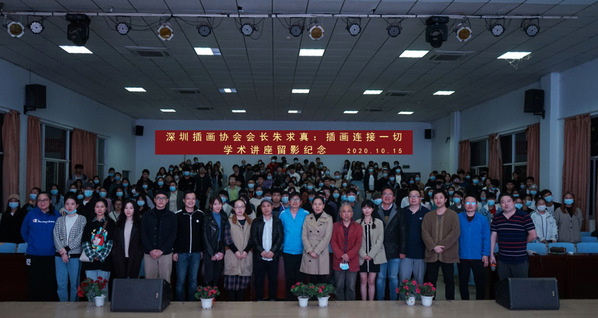 新闻中心讯(特约记者 徐慧 丁真)10月15日晚7:00,深圳插画协会执行会长、秘书长朱求真应邀来到米乐mile官方网站,为艺术与设计学院200多名师生带来了一场题为“插画连接一切”的学术讲座。深圳插画协会会长助理朱维、曾立文,湖北美术学院当代公共图像传播研究中心研究员,深圳插画协会常务理事长武汉办事处主理人王晓亮,湖北省包装联合会设计委员会副会长周静,湖北美术学院副教授凃志初,艺术与设计学院院长王海文、副院长何轩及全院教师出席了本次讲座。讲座由绘画系主任周全老师主持。
