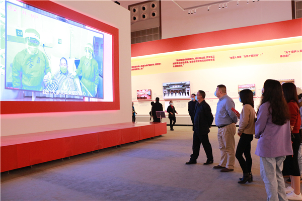 据悉,“人民至上 生命至上——抗击新冠肺炎疫情专题展览”总面积9000平方米,包括六道门廊、序厅、尾厅和六个主题内容展区,共有21个单元,展线1445米,展出照片1100余张、实物展品1000余件(套)、视频45个、大型场景33处、设计互动项目18处……总计超过6000项的展览要素,通过图片、文字、视频、实物、模型、互动体验等多种表现形式,辅以互联网+、VR、AR等手段,再现惊心动魄的大战大考。