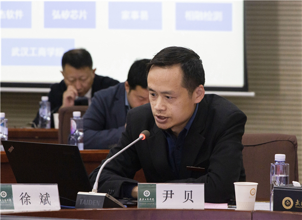 图为尹贝部长介绍学校产学研特色项目介绍 摄影:陈爱媛