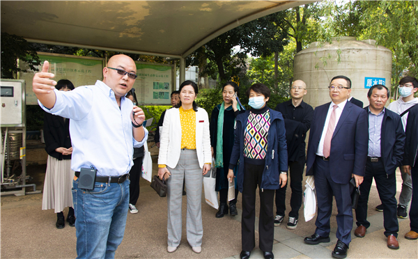 图为彭秀春董事长(右一)向民进湖北省委会专职副主委周建元(中)介绍垃圾无害化处理及资源利用校企协同项目 摄影:陈爱媛