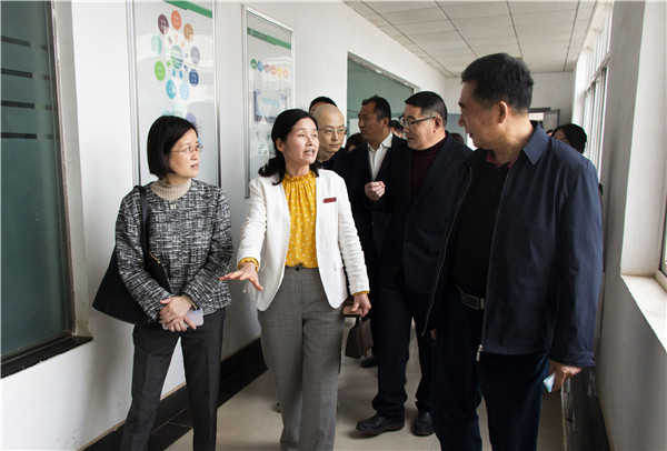 图为彭秀春董事长(中)带领湖北民进企业家联谊会成员参观实验教学中心 摄影:陈爱媛