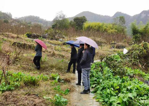 11月7日上午,邱微鹏、刘模发在九畹溪镇人大副主席谢永彪、学校驻村工作队队长王强及穿心店村党总支书记李刚的陪同下,冒雨实地考察村里的小水果种植基地及大棚建设基地,围绕小水果的选种、栽种、病虫害防治等方面为当地农户提出改进意见和建议,并提供技术指导。
