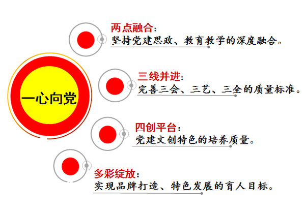 学院党支部全面贯彻新时代党的建设总要求和新时代党的组织路线,坚持“五个到位”建设目标,创新“一心、二点、三线、四创、多彩”党建思政特色工作思路。坚定为党育人、为国育才的初心使命,确保党组织领导核心和运行机制到位,确保立德树人和思想政治工作引领到位,确保党组织政治把关和制度执行到位,推动学院改革发展到位。此外,学院坚持党建思政与教育教学的深度融合,结合艺术学科专业特色,以“党建思政”为载体,将“思政点”有机融入专业课的“面”,坚持“三会抓建设” “三全塑团队” “三艺传精神”,推创“红微艺术”“金羽翼”“字绘中国”等党建品牌阵地。