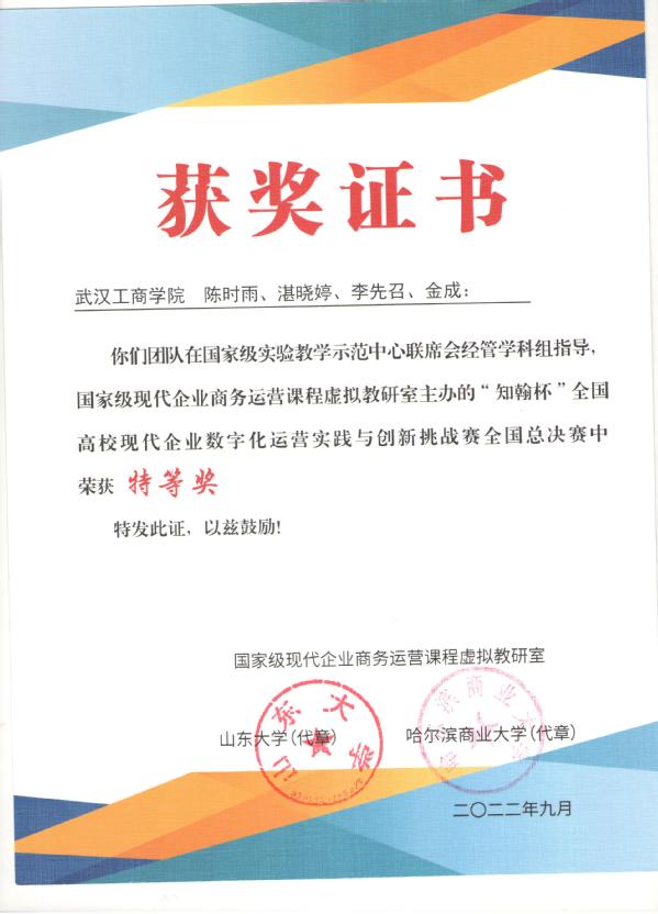 新闻中心讯(特约记者 刘佳欣 记者 杨小婷 见习记者 杨培)近日,由教育部国家级现代企业商务运营课程虚拟教研室主办,山东大学、哈尔滨商业大学承办的2022年“知翰杯”全国高校现代企业数字化运营实践与创新挑战赛(百团大战)全国总决赛落下帷幕,经过全国共281支队伍激烈角逐,最终由米乐mile官方网站管理学院工商管理系副教授黄颖老师指导,工商管理专业的学生陈时雨、湛晓婷、李先召、金成组成的“尔雅陈时雨”团队斩获特等奖,学生邹安琪、谢朝荣、王魏青、余嘉程组成的“FOUR”团队获得优秀奖。