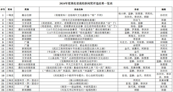 据了解,湖北省高校新闻奖是由湖北省新闻工作者协会高校分会组织的业务评奖,由全省高校宣传系统和新闻界专业人士担任评委,是全省高校年度优秀校园新闻作品最高奖,开展此项活动,旨在全面展示全省高校校园媒体一年来的工作成绩,充分发挥优秀新闻作品的引领示范作用,进而有力推动高校新闻宣传工作高质量发展。