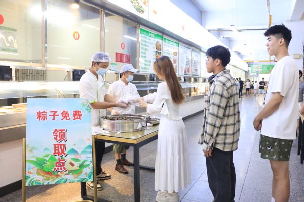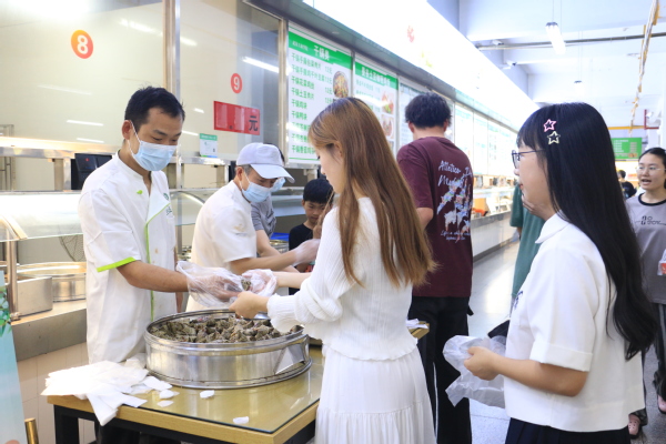 此外,为了让在校师生也能感受到浓浓的关爱,当天学校还特别准备了10000余份粽子,在一、二食堂设置粽子发放窗口,免费给全校师生品尝。一大早,食堂工作人员就忙碌起来,将热气腾腾的粽子摆出来。窗口前很快就排起了长长的队伍,前来领粽子的师生都笑容满面,现场洋溢着浓厚的节日氛围。