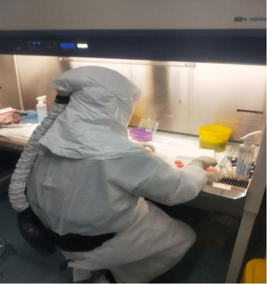 图为罗杨正在省疾控P2实验室提取涉疫样本