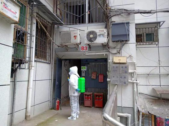 图为罗杨正在为疑似和确诊病例的楼栋消杀